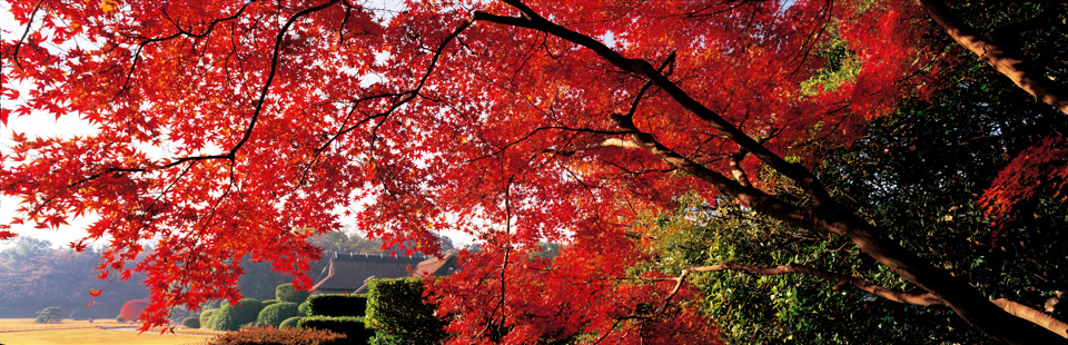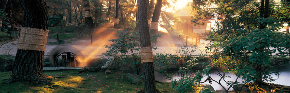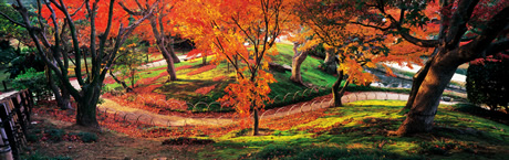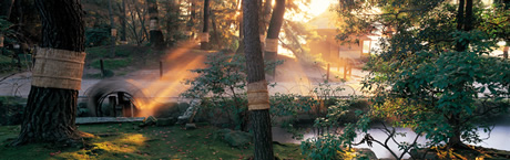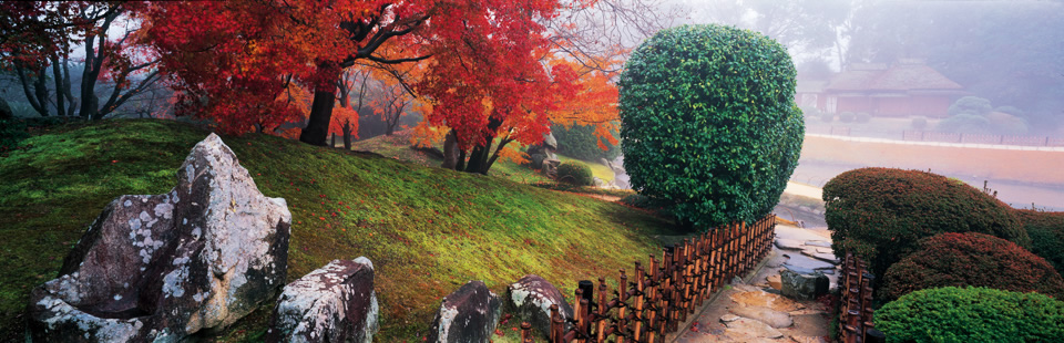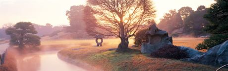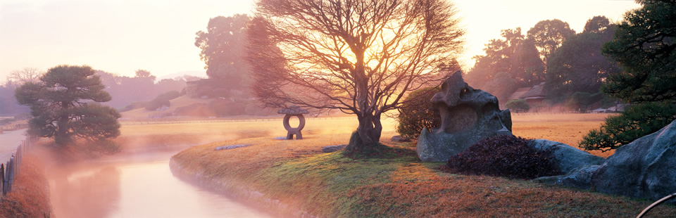 Namba has taken the photos of Korakuen over thirty years. His dynamic panoramas susceptibly reflect rare fascinating scenes of the garden.