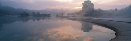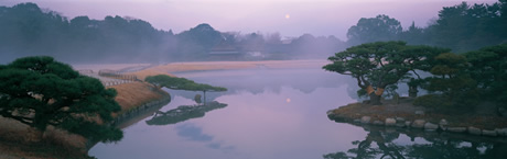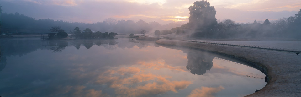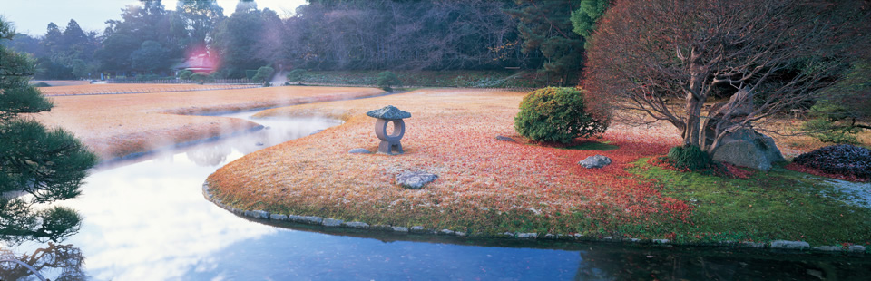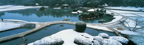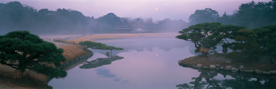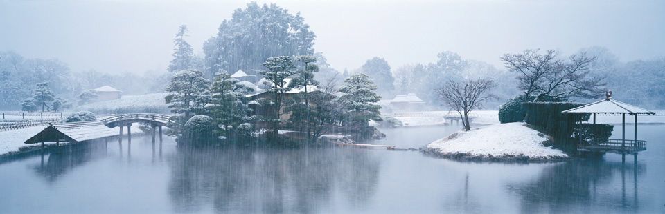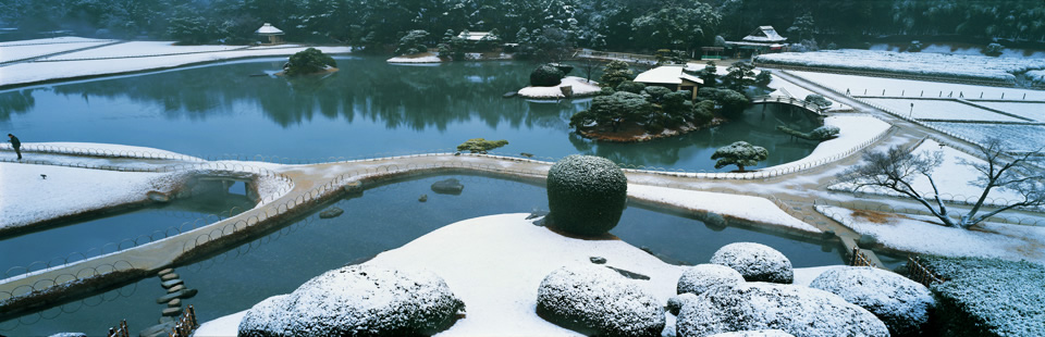 Namba has taken the photos of Korakuen over thirty years. His dynamic panoramas susceptibly reflect rare fascinating scenes of the garden.